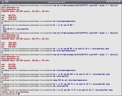 Mit abgeschaltetem Lüfter, 91MHz FSB, niedriger Core-Spannung und drei Minuten bzip2 landete bei mir die Prozessortemperatur bei 61°C, was wohl gerade noch im Rahmen liegt. Ich überlege, das Modul in das Xubuntu-Image aufzunehmen und per Startupscript eine FSB-Frequenz von 85 bis 91MHz einzustellen (3MHz-Schritte), ohne Änderungen an der Lüftersteuerung vorzunehmen, bräuchte dafür aber noch Erfahrungswerte von anderen Nutzern. Mittelfristig wäre natürlich an ein kleines, in Python geschriebenes Applet fürs XFCE-Tray zu denken.