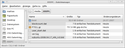 Mit Erscheinen von Ubuntu 8.10 und der Auffächerung der EeePC-Palette ist das hier vorgestellte Image für die meisten Benutzer hinfällig geworden. Falls Sie es dennoch testen wollen: Das angebotene Image funktioniert nur auf EeePC 701 und mit geringem Mehraufwand auf EeePC 900. Atom-basierte EeePCs werden nicht unterstützt.